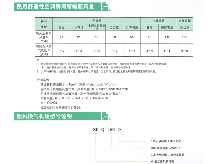 使用面積:應(yīng)根據(jù)房間空間大小及室內(nèi)人員數(shù)量綜合考慮,根據(jù) “每人所需新風(fēng)量”和“房間新風(fēng)換氣次數(shù)”計(jì)算出新風(fēng)量,然后選型。